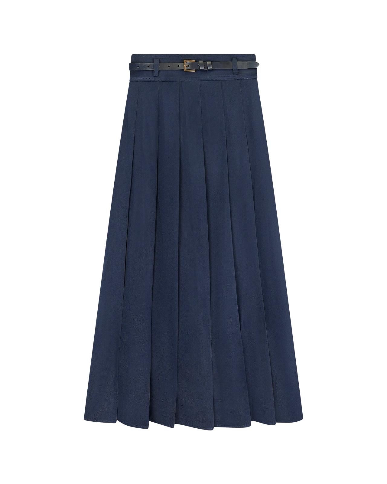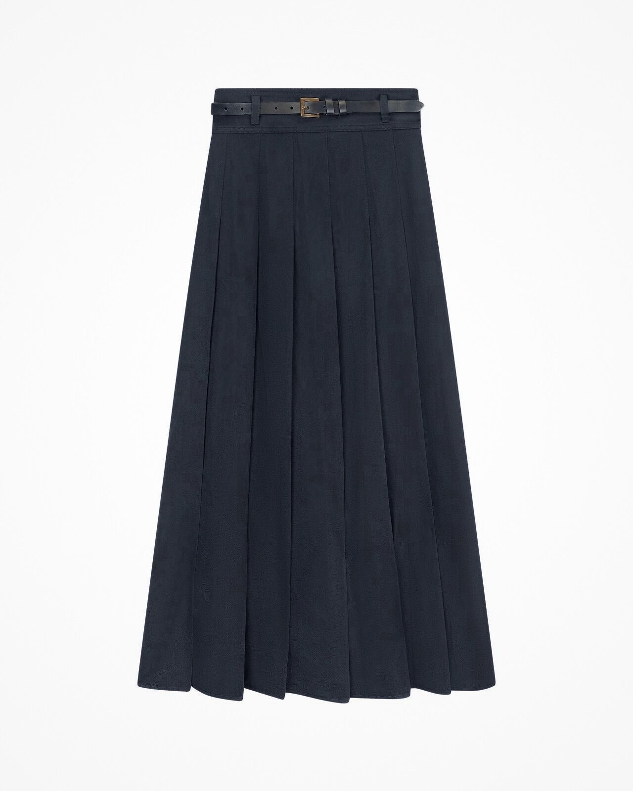 The AVIGAL AL128 Black Pleated 36"-38" Skirt with Belt, crafted from 100% polyester, feels lightweight and smooth with a crisp texture, offering wrinkle-resistant comfort and a flowing drape that holds pleats elegantly.