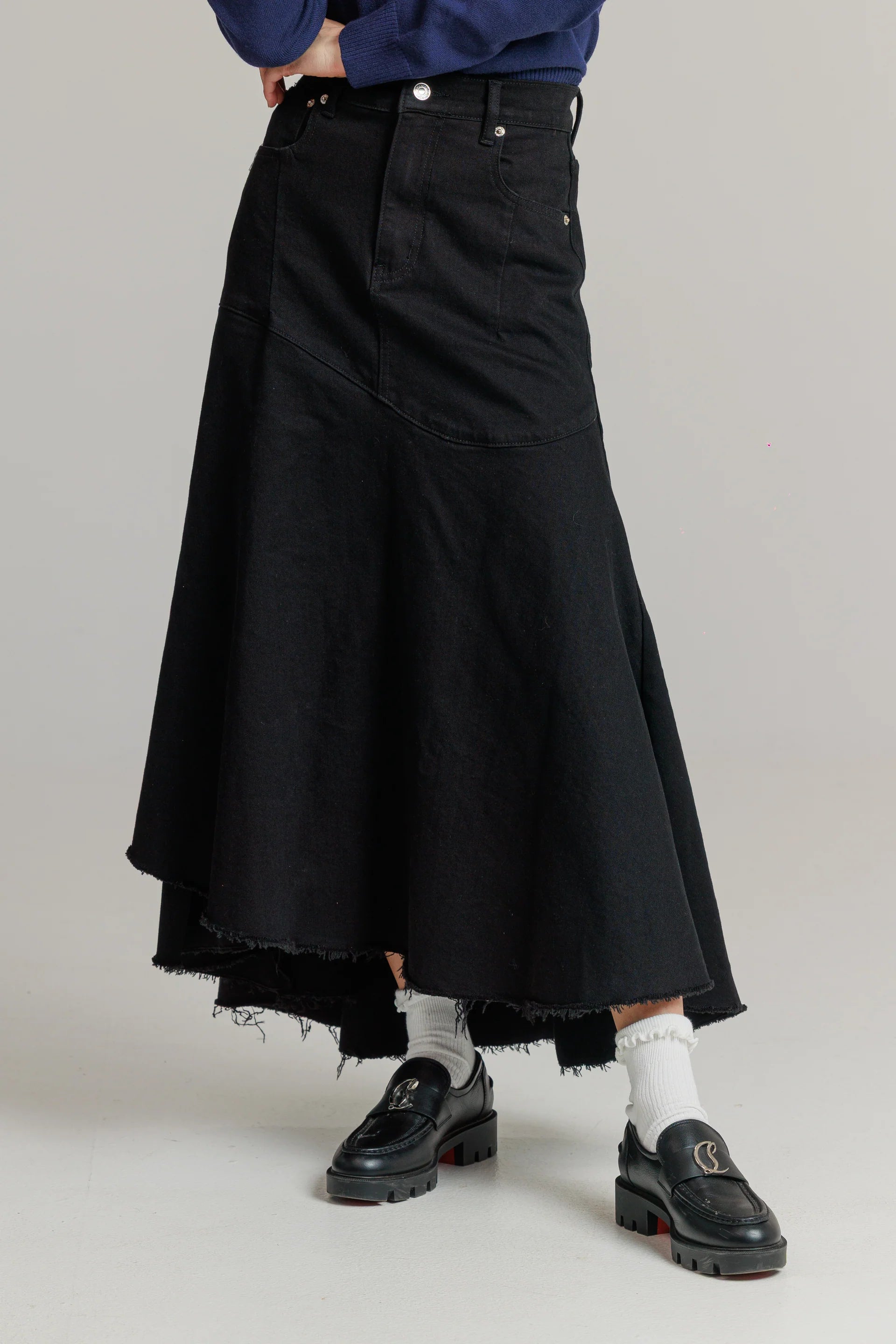 LOUP DCF0017 Black Denim Everyday Stretch 35" Skirt contours in soft, flexible black denim that blends comfort with casual edge. It sways with easy, forgiving movement, feeling like a second skin, supple and breathable, with a gentle, worn-in hug.