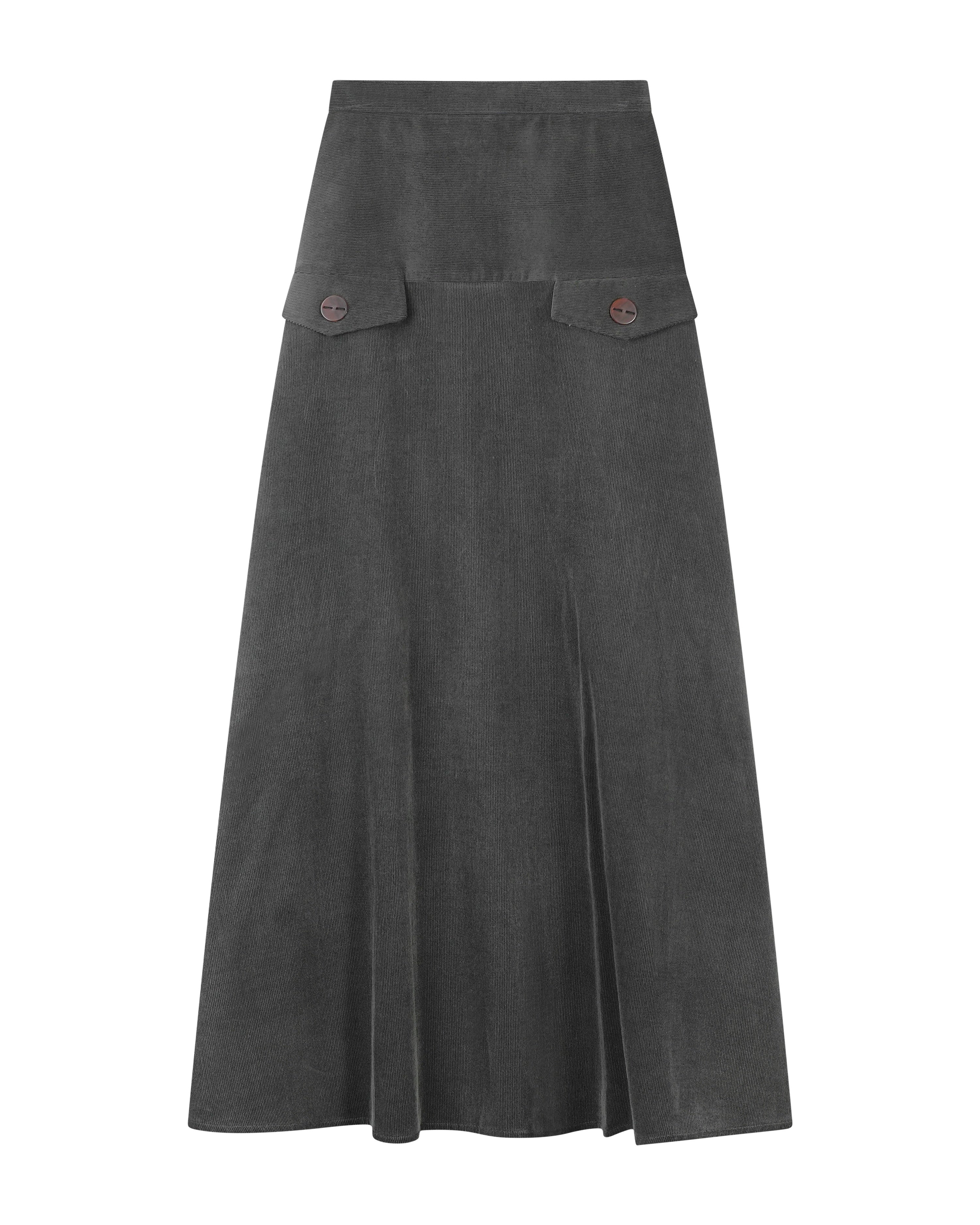 Mignon Doo FW25S14 Gray Yoke Placket Corduroy Skirt. This gray corduroy skirt features a yoke design with a placket front, giving it a structured yet refined appeal. Its textured fabric offers both warmth and elegance, making it perfect for modest and versatile styling.