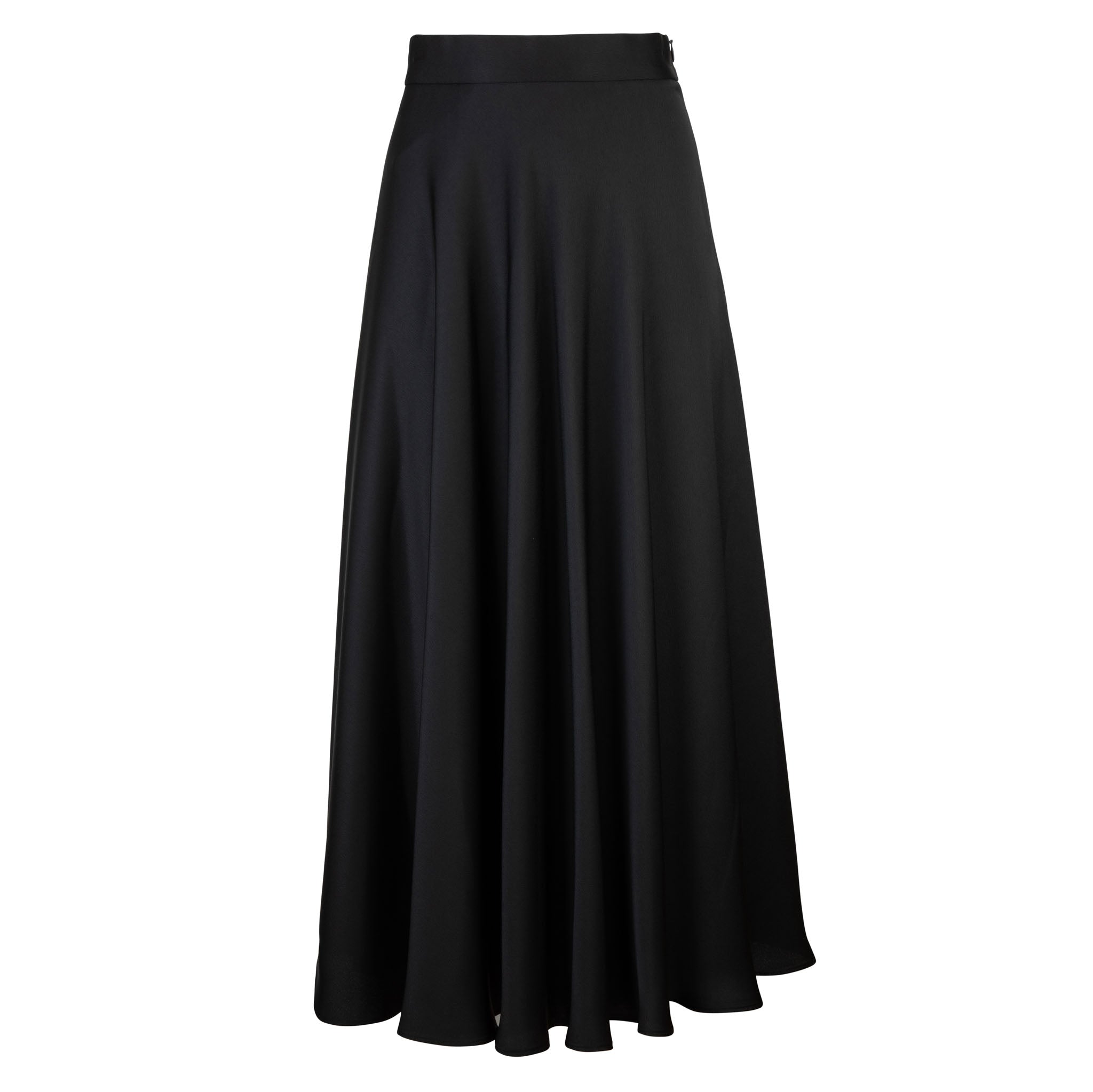 The JSE Couture SH644 is a 31" circle skirt crafted from lightweight black crepe. It features a full, flowing silhouette that moves gracefully, offering a modest and elegant look—perfect for both everyday wear and more dressed-up occasions.