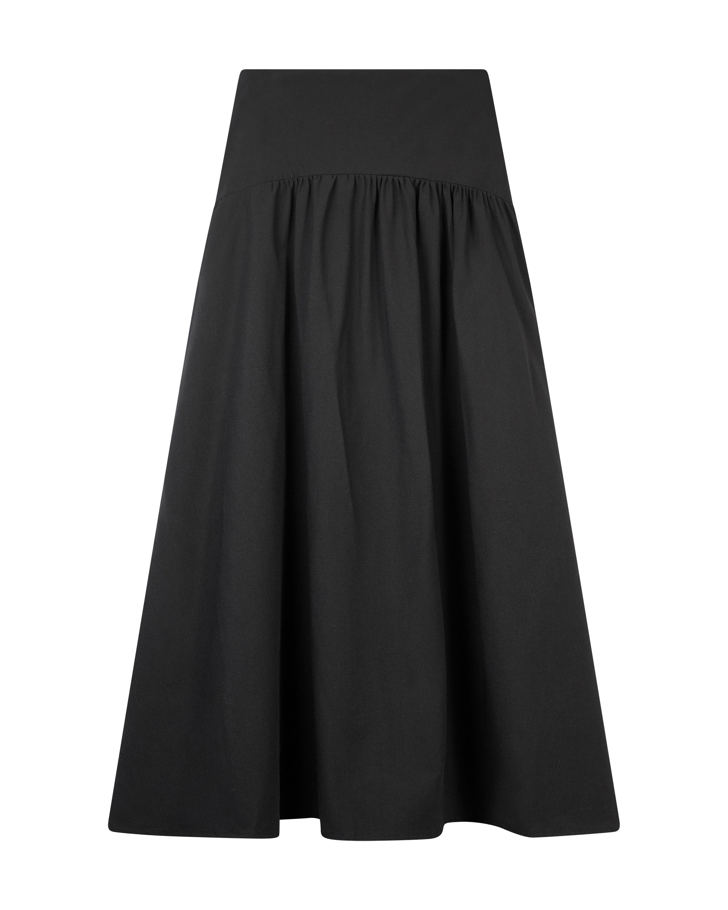 Peode SK-0106 Black Yoke Skirt with Lining. This black skirt features a clean yoke design with a lined finish for added comfort and modesty. Its simple yet structured cut makes it an easy-to-style piece for both casual and dressy looks.