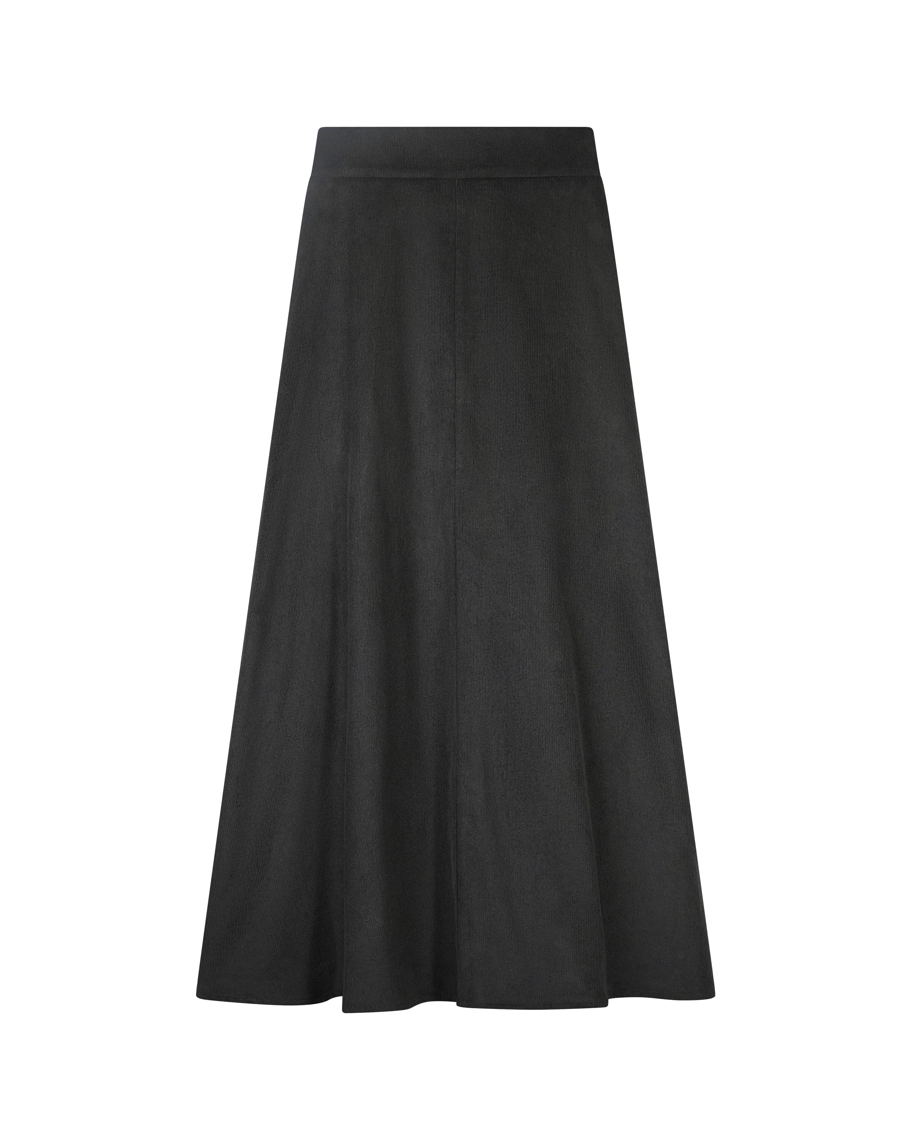 Peode SK-1406 Black Corduroy Skirt. This black corduroy skirt brings a soft, textured finish with a timeless A-line cut. Its modest style and comfortable fabric make it an easy go-to for both casual and dressy occasions.