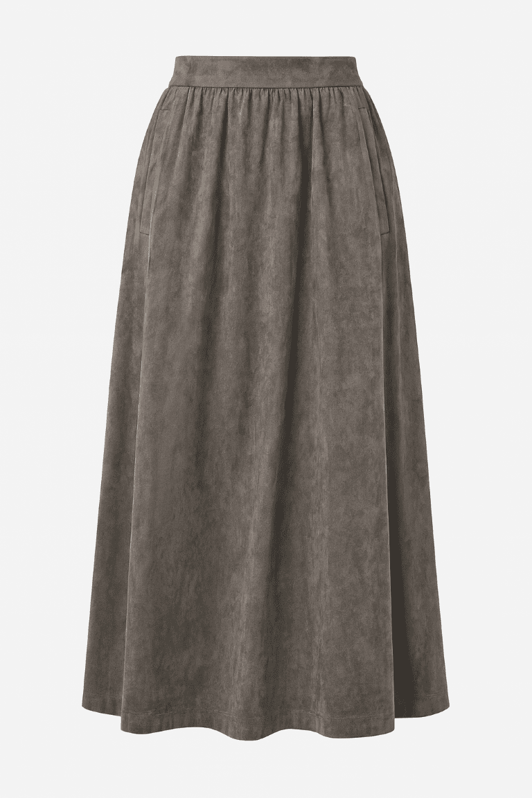 Valour SV26915G Gray Suede 40" Skirt is fashioned from a premium faux suede fabric that feels incredibly soft and luxurious with a velvety finish. This elegant maxi skirt features subtle textural detailing (shrinks/shirring) that adds visual depth and a beautiful, flowing drape.