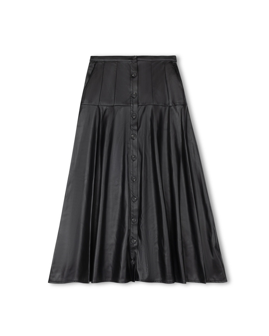 The Beige W-21516 Brown Cinca Leather Yoke Panel Front Buttons 36" Skirt is a chic midi skirt crafted from a faux leather or polyurethane blend, featuring a distinctive yoke panel and front button details for a tailored silhouette. This skirt offers modest luxury with its smooth, structured faux leather, providing a comfortable, polished fit.