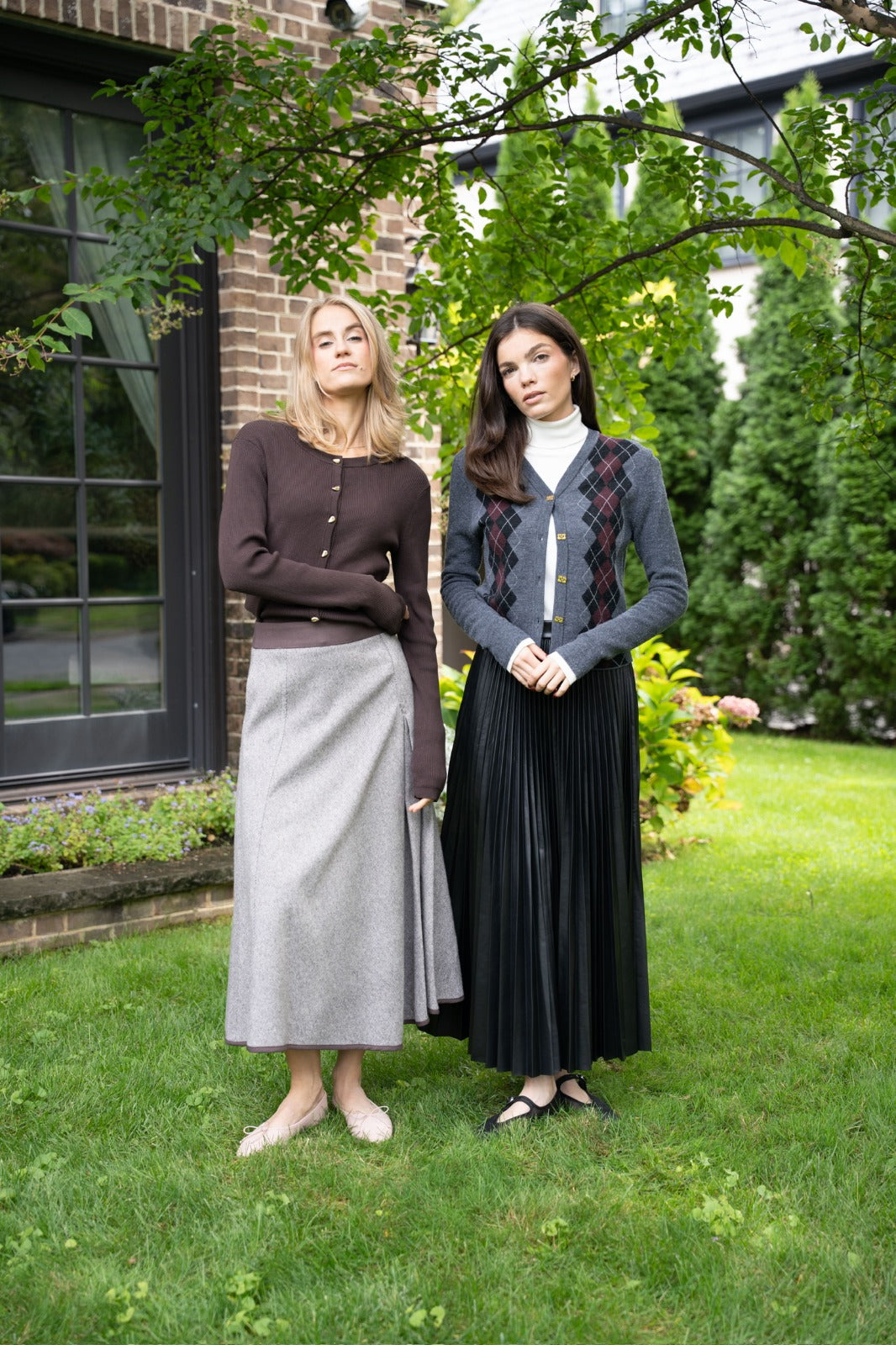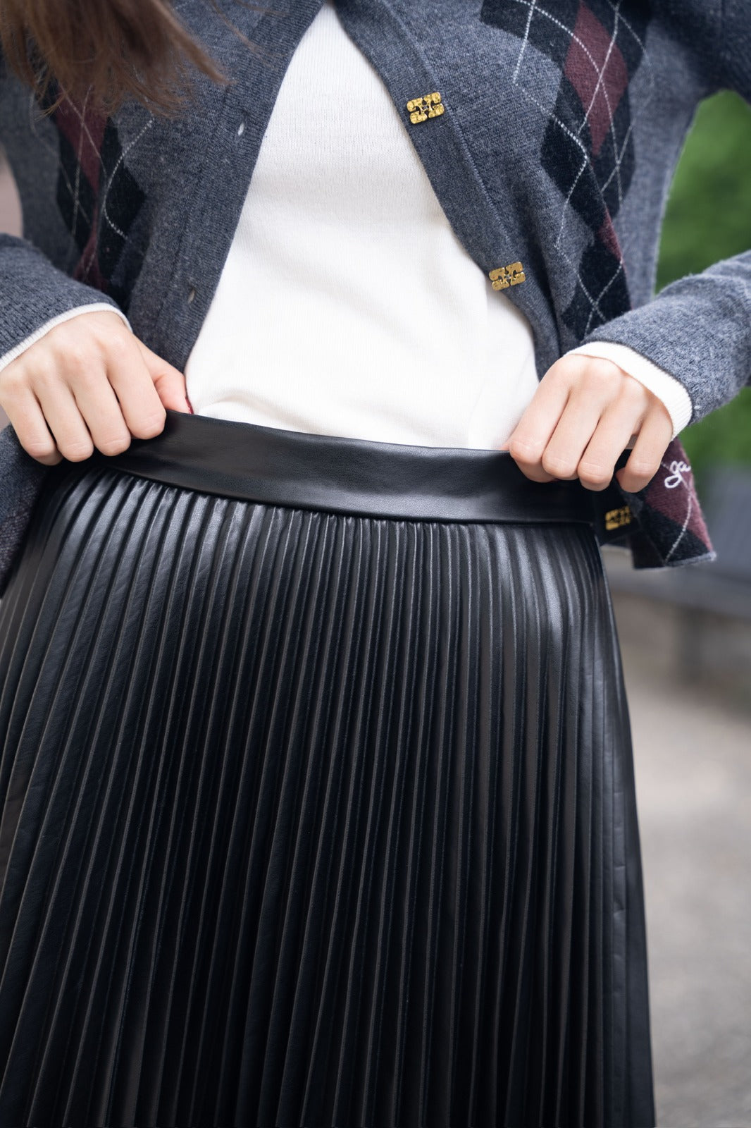 The Nostalgia W-22282 Black Doby Leather Pleat Skirt blends sleek sophistication with modest flair. Crafted from textured doby leather, it features sharp pleats that create graceful movement while offering a contemporary edge, making it a versatile piece for both day and evening wear.