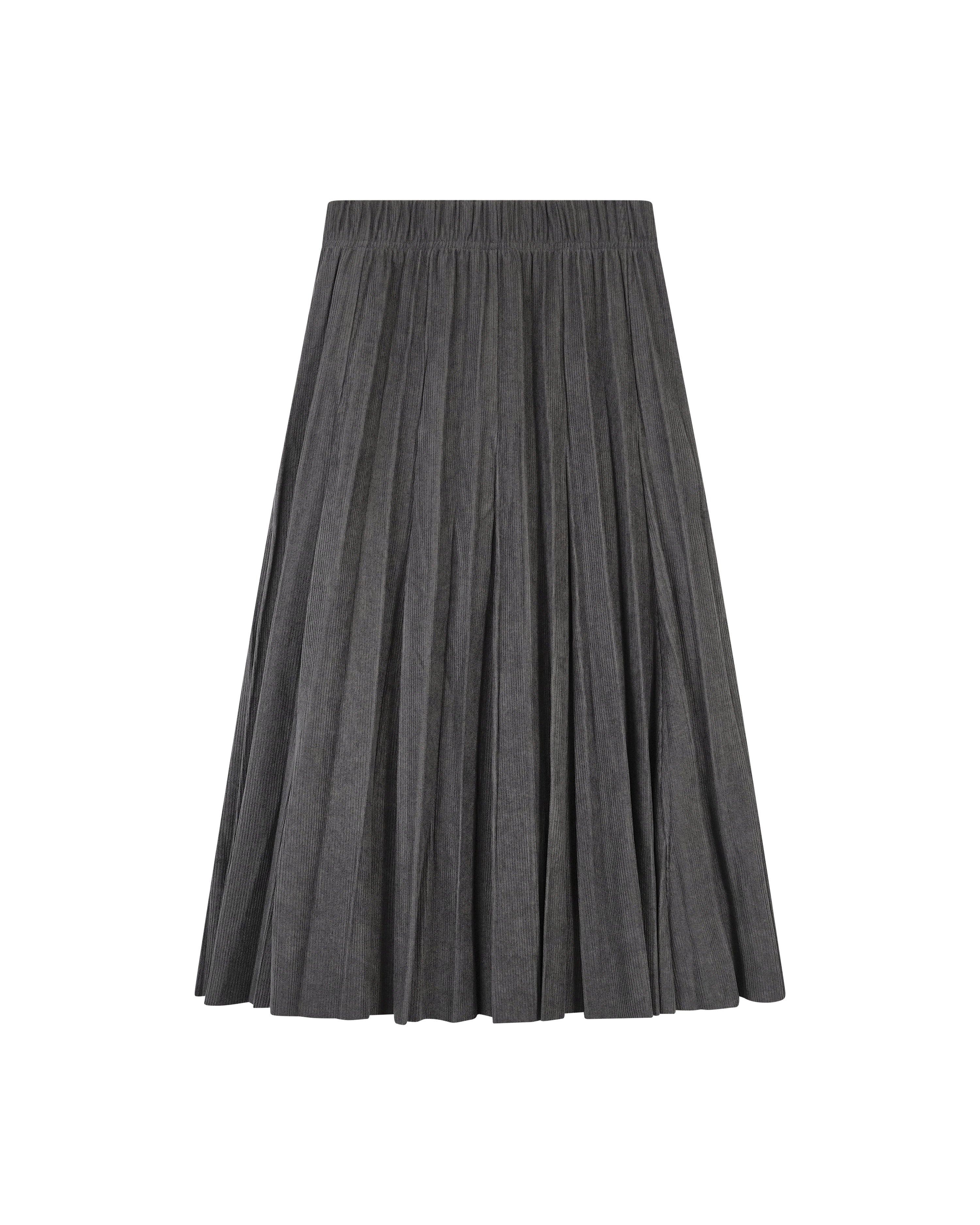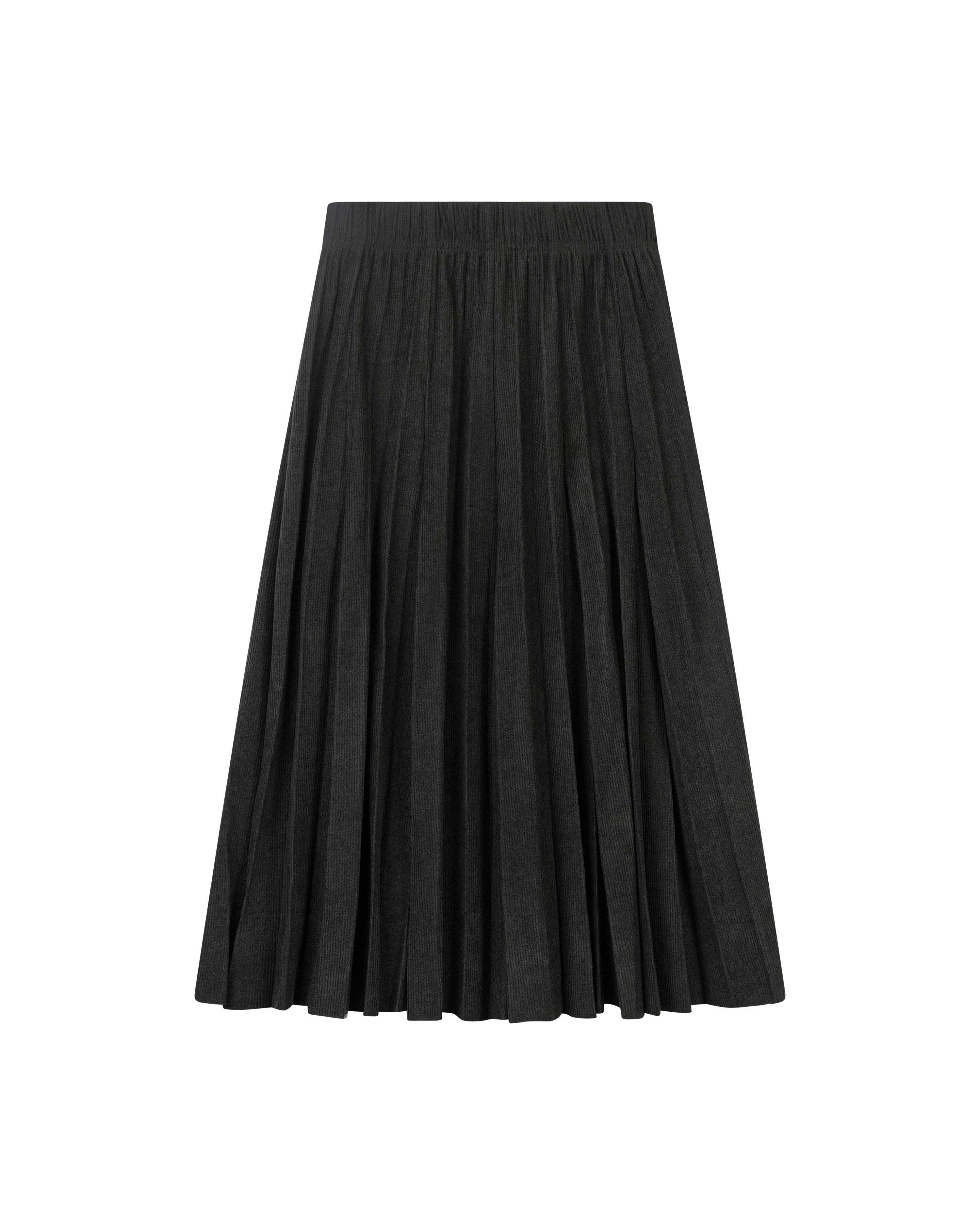 Aspect WB4CPT7064R Black Corduroy Crinkle Pleated Skirt. This black corduroy skirt features a crinkle-pleated design that adds depth and texture to its modest silhouette. Soft yet structured, it’s a versatile piece for everyday wear or styled for a more polished look.